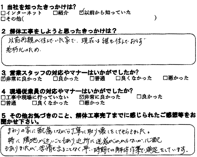 長年空き家になっていたご実家の取り壊しをさせていただきました。整地し、きれいな更地になったことで売却しやすくなりましたね。購入したい人にとって、古家付の土地より更地にした状態の方が、イメージがわきやすく、選んでいただきやすいです。思い入れのあるご実家を解体させていただき、ありがとうございました。